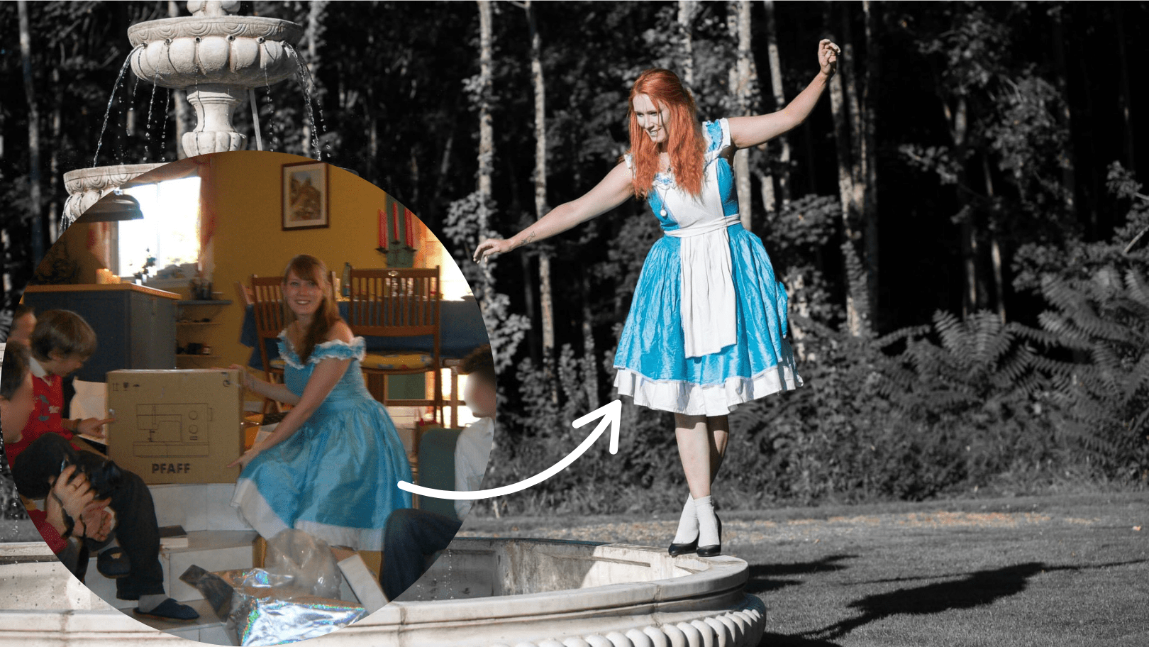 Dans l'ordre : la fameuse robe jaune (2008), une robe inspiration Empire (2011), un cosplay de Pimkie Pie (2017), et le Capitaine Crochet (2025)