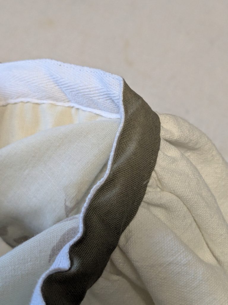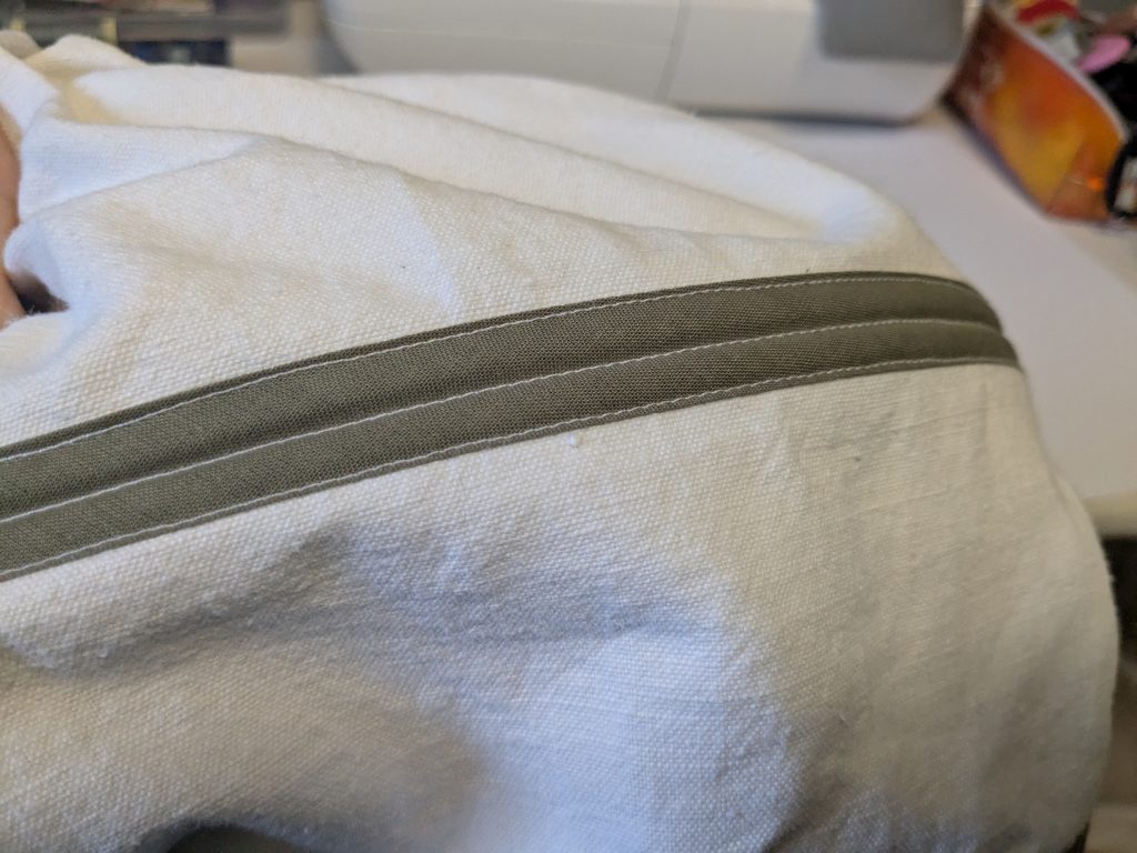 Le ruban de sergé ne faisant que 2 cm de large, il est trop juste pour se replier sur la marge de couture des paniers. J’ai donc cousu une bande de biais de 17 cm au ruban de la ceinture. Ensuite, je pique à la machine mes paniers sur le sergé, puis je viens rabattre le biais à la main.