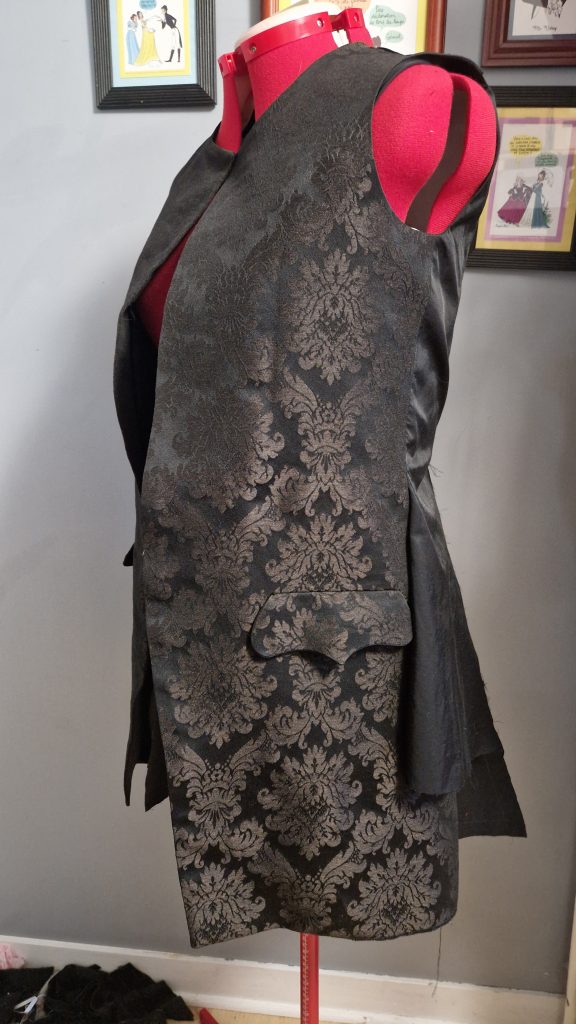 Dans la silhouette du début XVIIIe, les gilets sont longs, comme les vestes, et se raccourciront tout au long du siècle. Ce n'est évidemment pas une pièce obligatoire pour faire du pirate mais elle est facile à réaliser, ne demande pas trop de tissu et permet d'avoir un costume complet et interessant même quand on enlève la veste alors pourquoi se priver ?