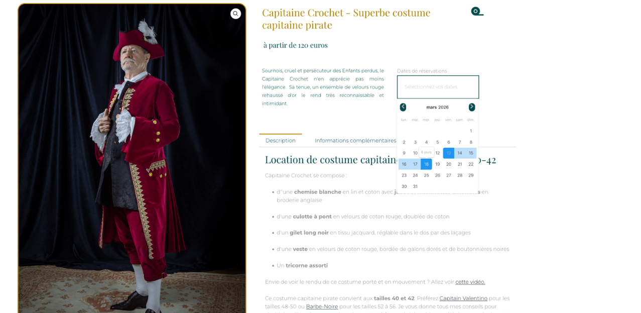Avant de valider votre panier, vérifiez bien les dates et les mensurations du costume.