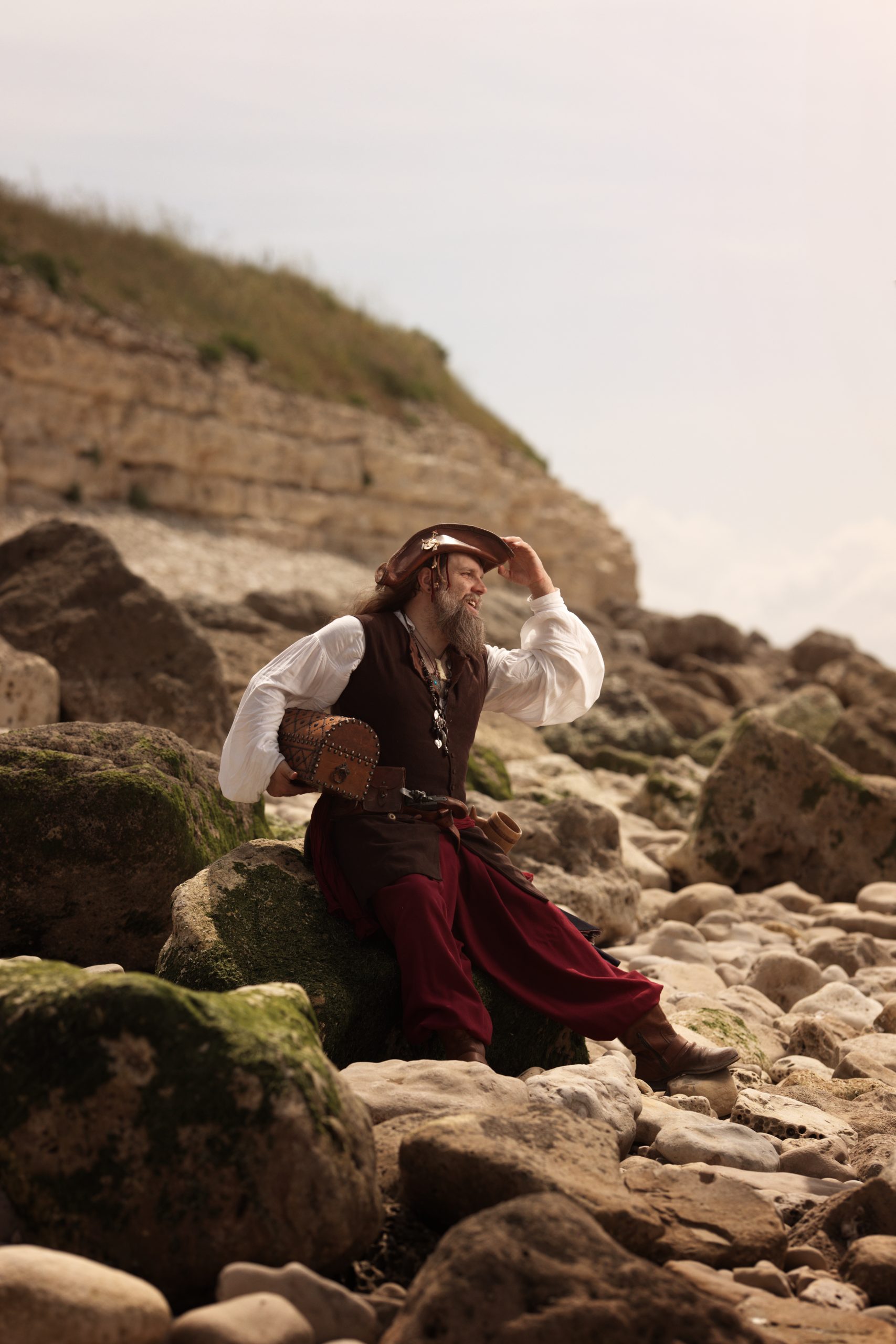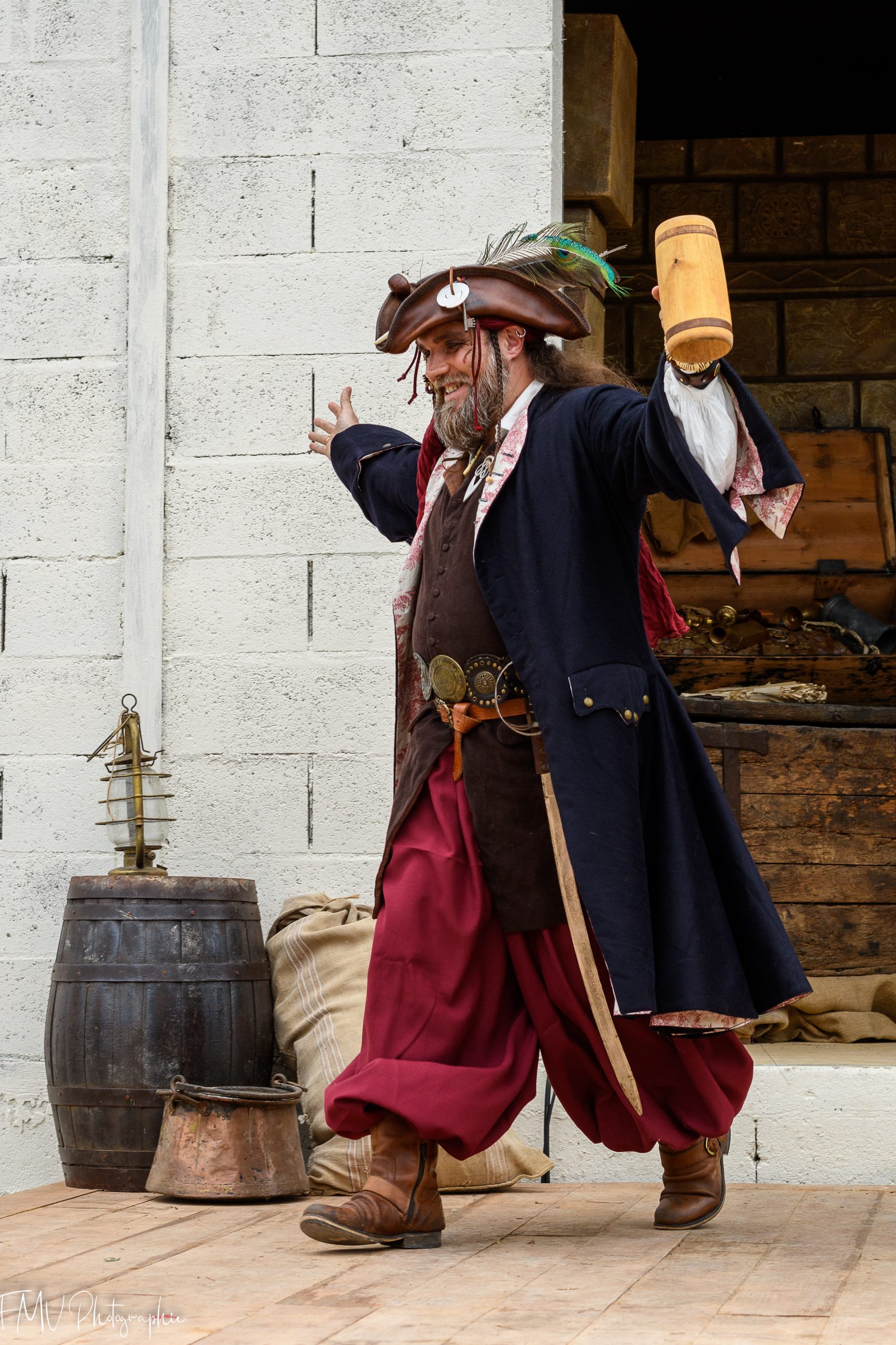 Ce costume pirate homme est inspiré de la mode masculine du début du XVIIIe siècle et du personnage haut en couleur de Captain Valentino, icône locale du festival pirate Pictav' Pirat Day qui se déroule à Poitiers tous les ans depuis 2017. Le costume a été imaginé avec l'aide du comédien qui l'interprète pendant le festival.