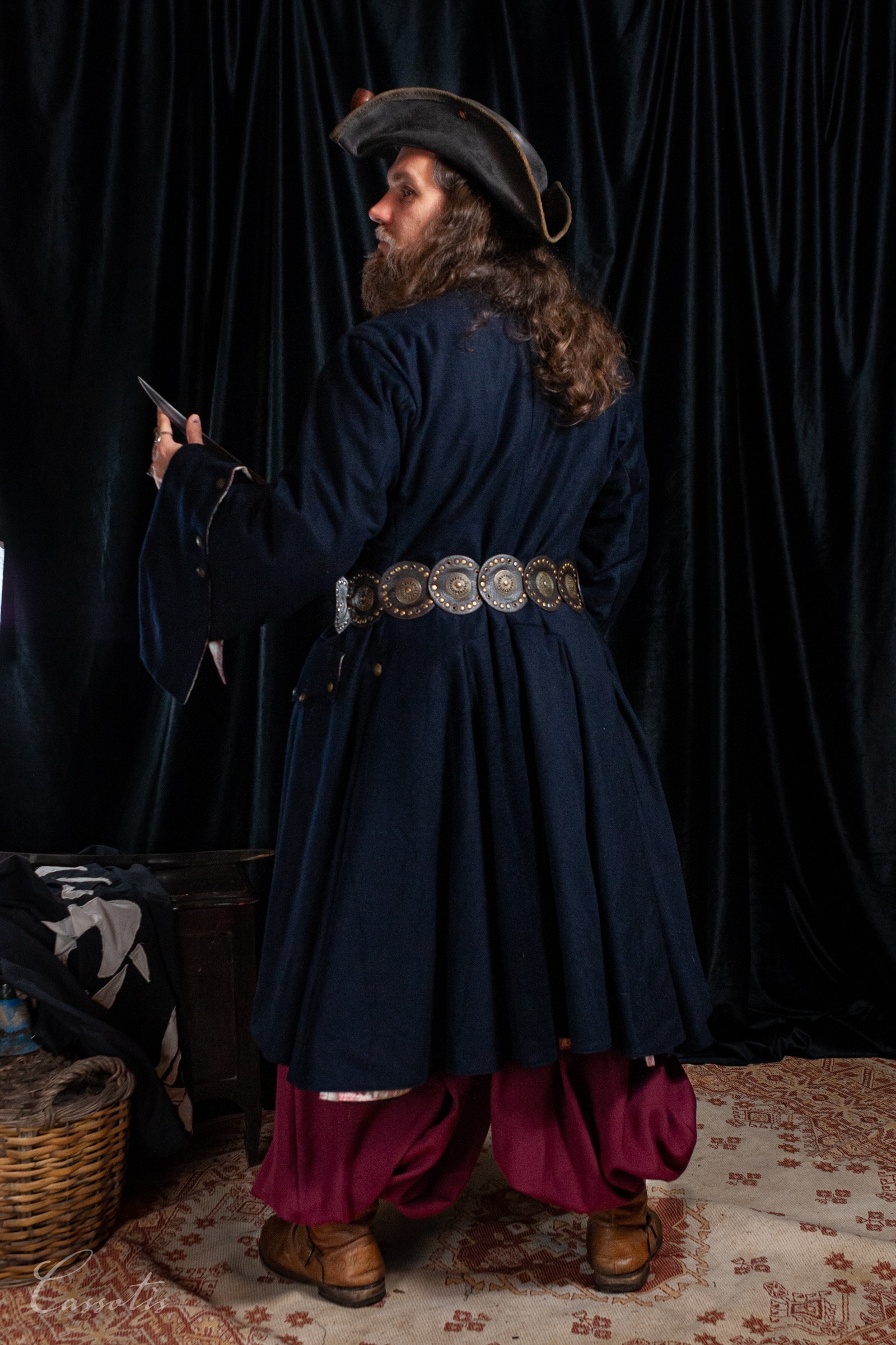 Ce costume pirate homme sort du lot grâce à l'alliance de couleurs profondes et au rendu des tissus en mouvement. La veste est basée sur un patron du début du 18e siècle, typique avec ses grands revers de manches et ses larges basques, qui appuient chaque geste et donne un caractère presque théâtral à l'ensemble. Le gilet long est aussi typique de l'époque et s'ajuste dans le dos par un laçage. Il peut se porter fermé mais aussi ouvert, sur la chemise. Le sarouel complète cet ensemble très fluide et confortable. La silhouette globale est crédible et très versatile selon les accessoires qui l'accompagnent.