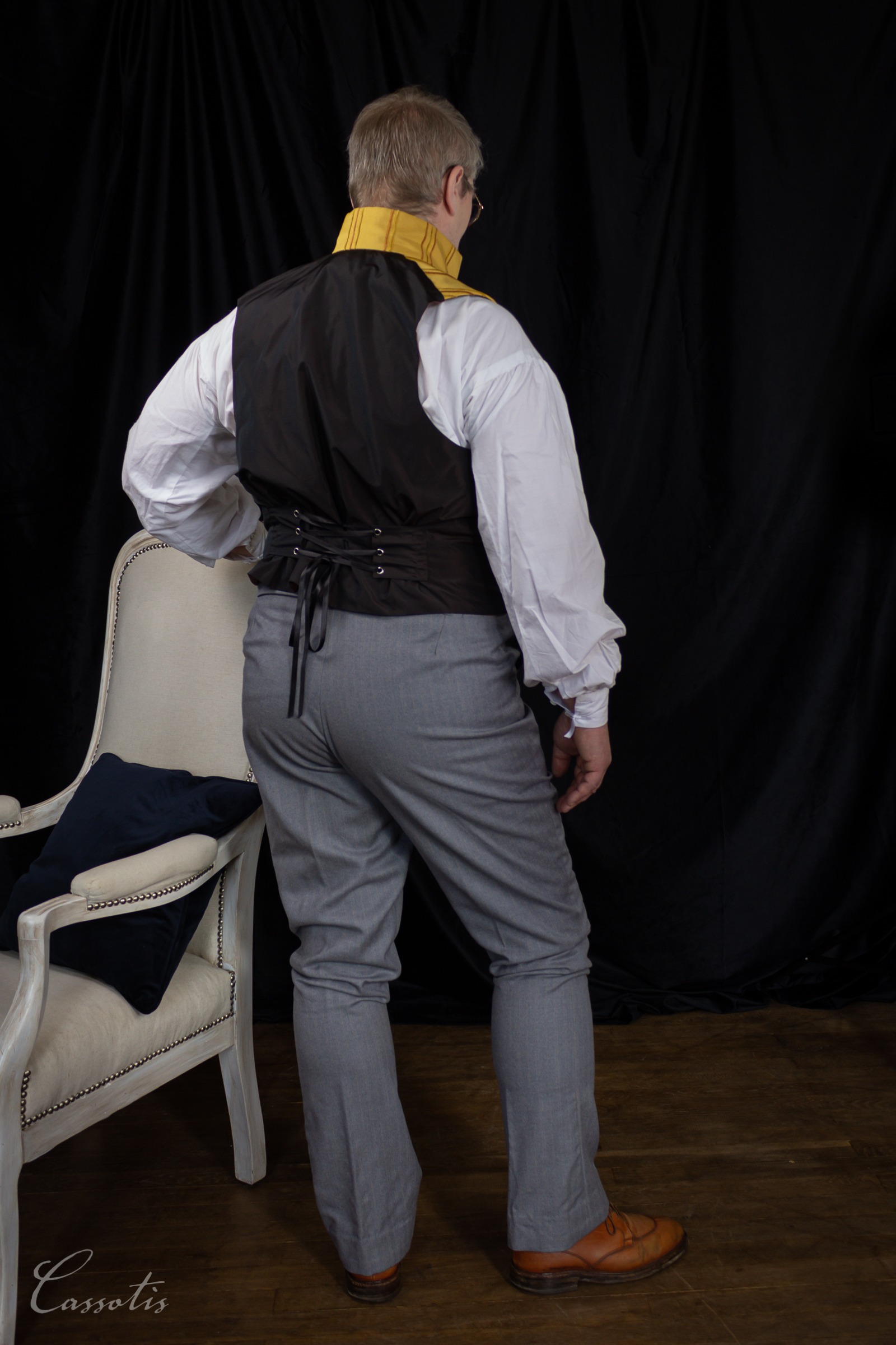 Ce costume Régence homme a été pensé pour vous donner la silhouette à la mode caractéristique du début du 19e siècle. Le pantalon haut allonge la silhouette et se resserre à l'arrière pour s'adapter à toutes les morphologies. Le gilet court est également ajustable à l'arrière par un joli laçage et enfin la veste longue donne toute la prestance nécessaire à la tenue d'un gentilhomme. La veste en laine est adaptée aux températures fraiches. L'ensemble est respirant et confortable à porter sur toute une journée.