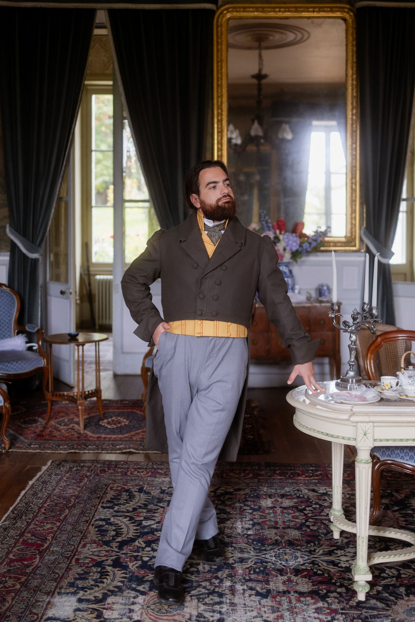 Ce costume Régence homme tient son nom de Charles Bingley, un des personnages principaux du roman Orgueil et Préjugés de Jane Austen. Je trouvais que des couleurs natures et douces lui convenaient bien.