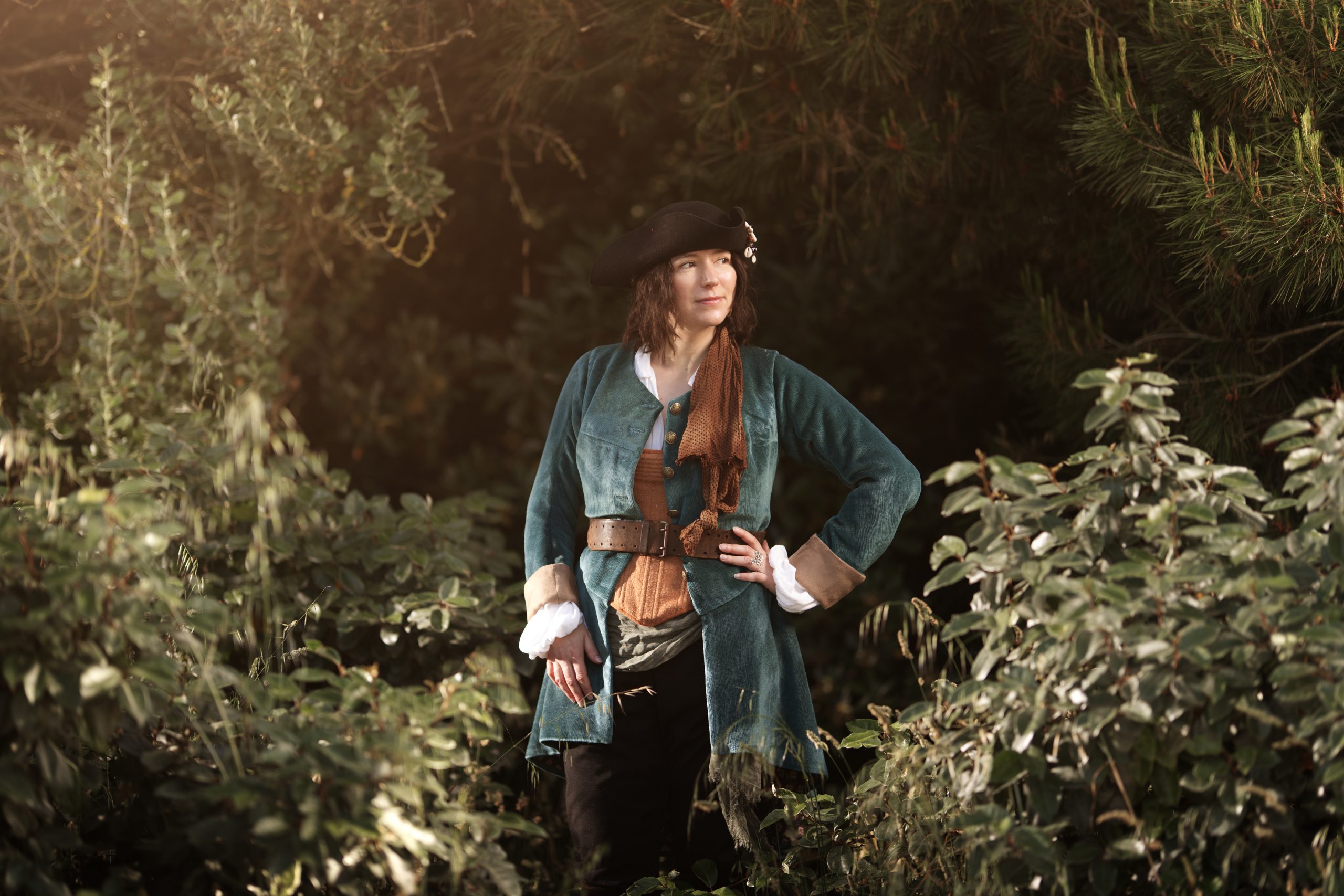 Cette tenue pirate femme mélange le meilleur des modes masculines et féminines du XVIIIe siècle : le confort du pantalon à pont, et l'esthétique de la silhouette cintrée. Le bleu canard vibrant de la veste s'associe avec l'ocre du corps baleiné pour créer une tenue simple et marquante, avec beaucoup de caractère. Le corset est légèrement baleiné et maintient la poitrine sans contraindre. La veste à larges basques accompagne les mouvements sans les entraver.